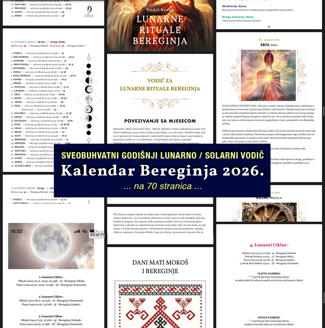 Kalendar Bereginja 2026. je sveobuhvatan Lunarno Solarni vodič za povezivanje i utjelovljenje vrlina Bereginja. Uz pomoć njega svakodnevno znaš koja je Bereginja u danu aktivna. A kroz vodiče u njemu kako možeš to iskoristiti za svoje dobro.